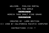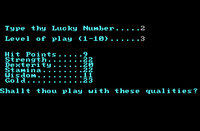 The player is then asked for a name and "lucky number", which is used to generate the terrain and attributes; mages can control magic amulets, while fighters can use any weapon. The map uses lines to indicate impassable mountains, Lord British's Castle, dungeons, and towns, supplemented by simple text descriptions similar to the ones seen in the early Ultima games. Holes also exist on the map, but no outline is present to warn travelers.