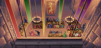 In Ultima V, the Britannys had expanded around the castle, which now sported a forge, a basement, stables, and numerous new storerooms and bedchambers. During this time of Lord British's disappearance and Lord Blackthorn's dictatorship, the absent king's bedchamber, which contained his sandalwood box and the fabled magic carpet, was kept under close guard.