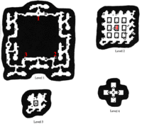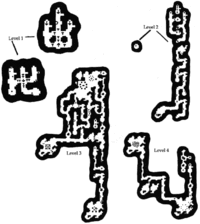 Right from the start, move east to access the ladder 1 to level two in the middle of the big hall. On level two moves west and right down the hole 2 to level three. On level three, take the ladder marked 3 that is in the west to get down to level four.