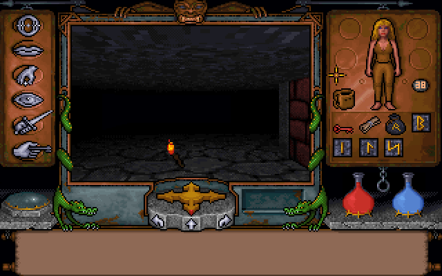 Ultima Underworld screenshot, PC version, showing dropped lit torch in dark room