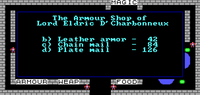 The Armour Shop of Lord Eldric D'Charbonneux is the armour shop of Britain, Fawn, Grey, Montor, Moon, Paws, Tune and Yew in the Lands of Lord British during the early Age of Darkness. The shop appears in Ultima I, both the Apple II original and 1986 PC remake; in the latter version, however, it is instead found in Britain, Arnold, Nassau and Gorlab.