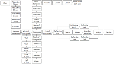 Descend the stairway. Just to the west of the crossroads, look to your right, and head into the woods to the south. There is an abandoned well. Descend down the rungs to enter the sewer maze. If you get too lost, the Guardian will come to taunt you, transporting you back to the start of the maze beneath the ladder.